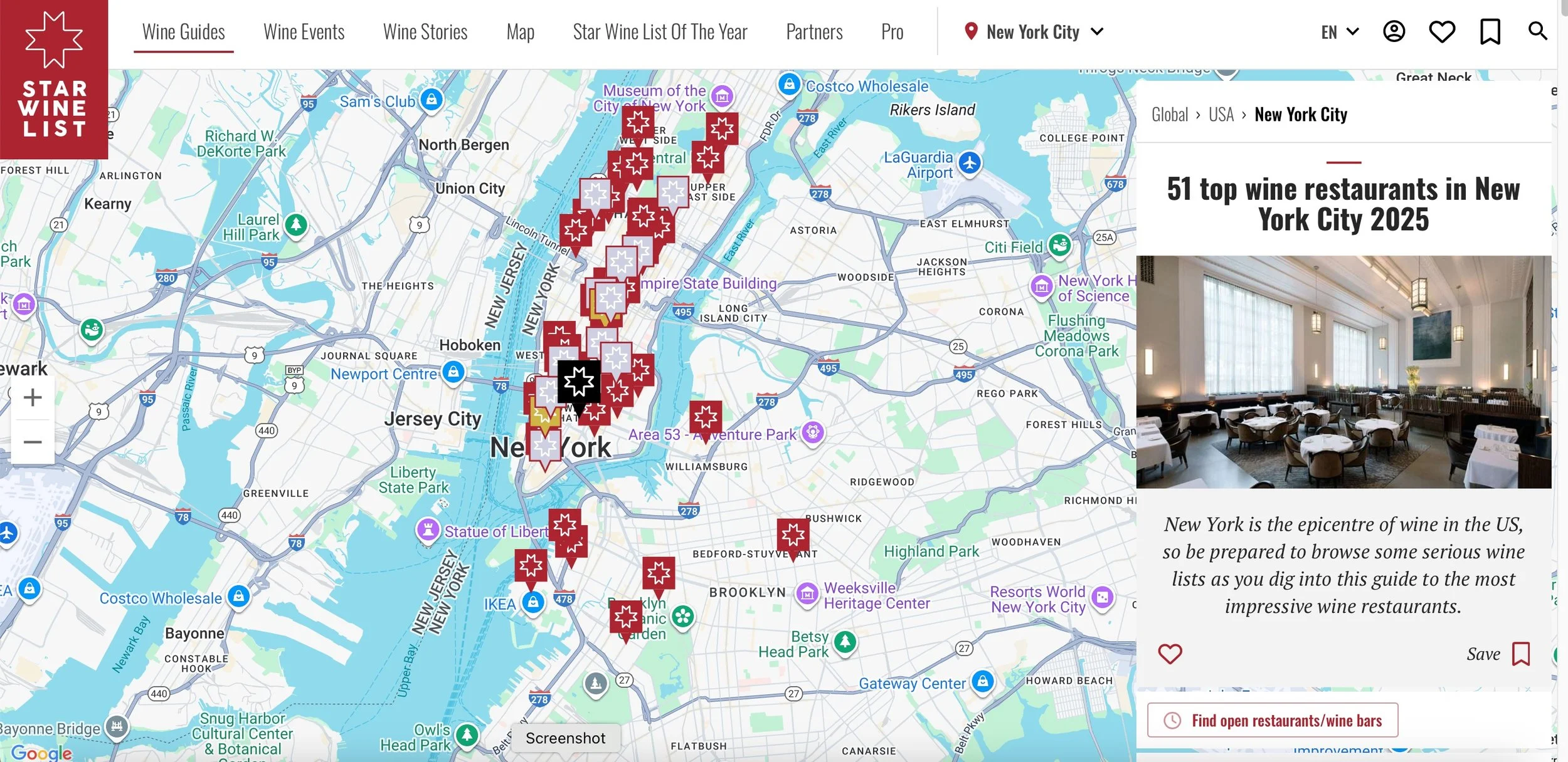 In brief, the site holds international competitions to identify the world’s best restaurant wine lists and sommeliers. But they also employ local experts to create wine guides to the restaurants in specific cities around the world, including some in the US. I won’t beat around the gorse, here’s the Star Wine List Guide to 51 restaurants in NY: